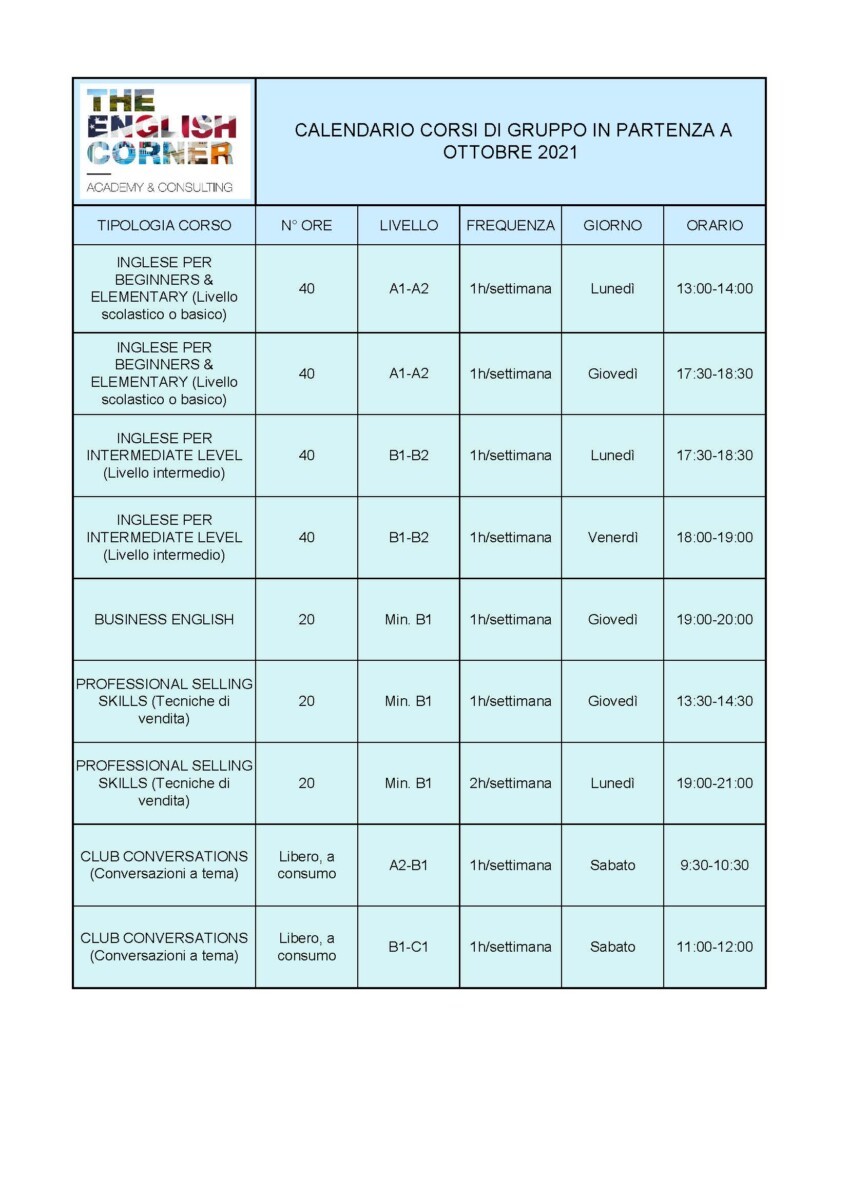 Anche le vacanze sono purtroppo finite, ma all’ English Corner tra Settembre e Ottobre 2021 ricominciano anche i Corsi di gruppo.